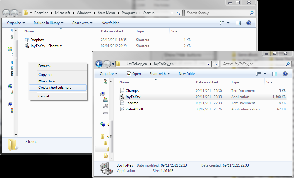 Now open a separate explorer and browse to the folder where you unzipped the JoyToKey files. Select the JoyToKey icon, right click and drag the icon to the Startup folder and chose Create shortcut here from the list that opens when you drop the icon.